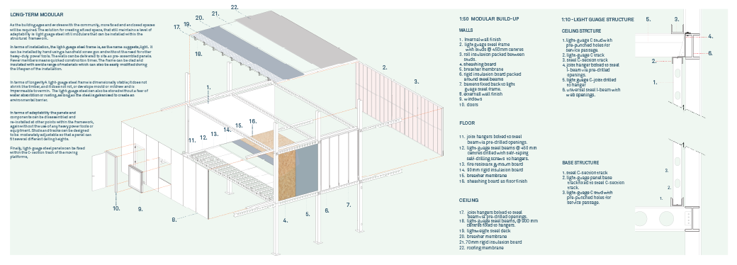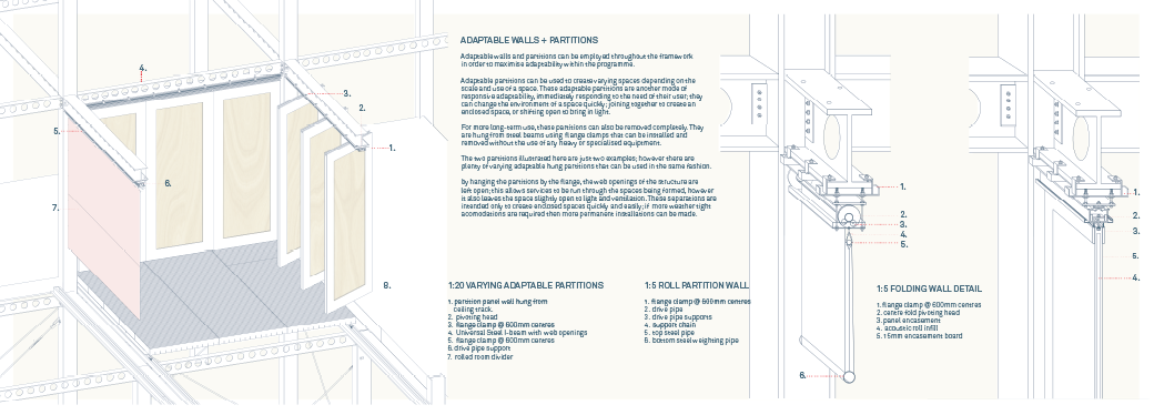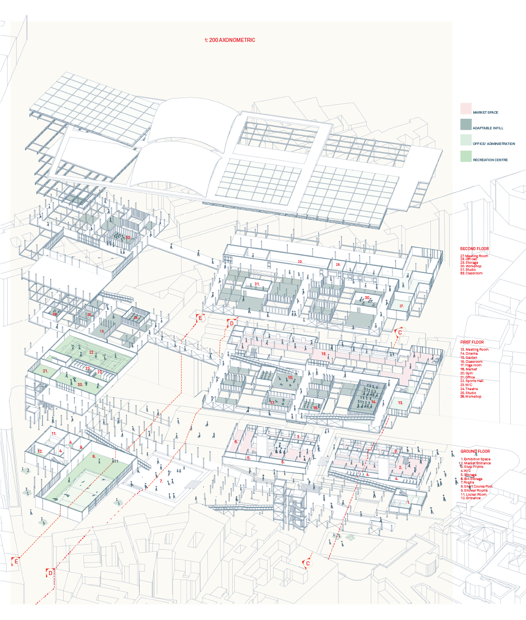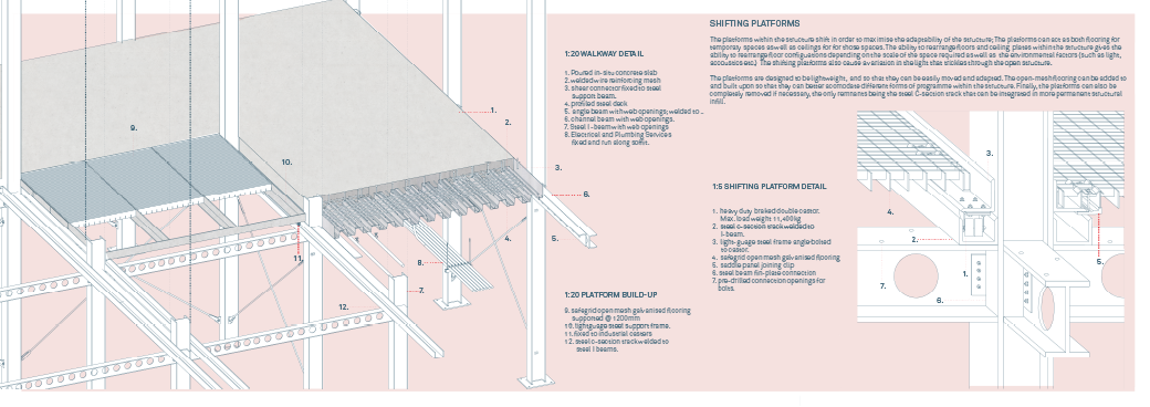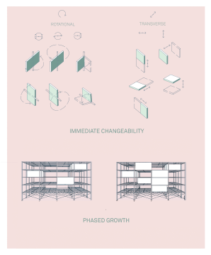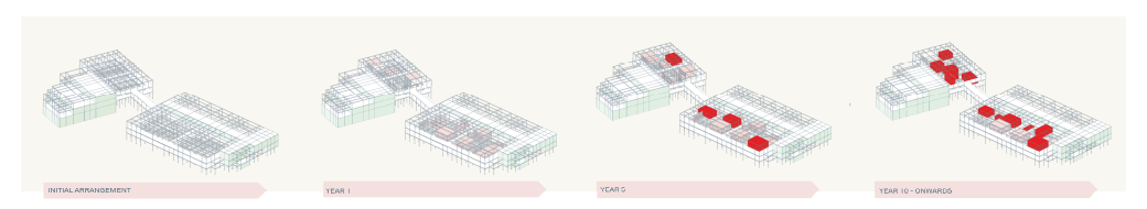 One form of adaptability, is one that immediately responds to the users needs; the ability to shift building components in a simple manner can change the environment, arrangement and use of a space in a way that is simple and immediate, in order to combat the tendency for stagnation. Another form of adaptability is the phased growth and insertion of different, more permanent, infill. This evolution of the structure over time, as specific and necessary uses can be determined, will allow the building to adapt and change with the community over a longer span of time.