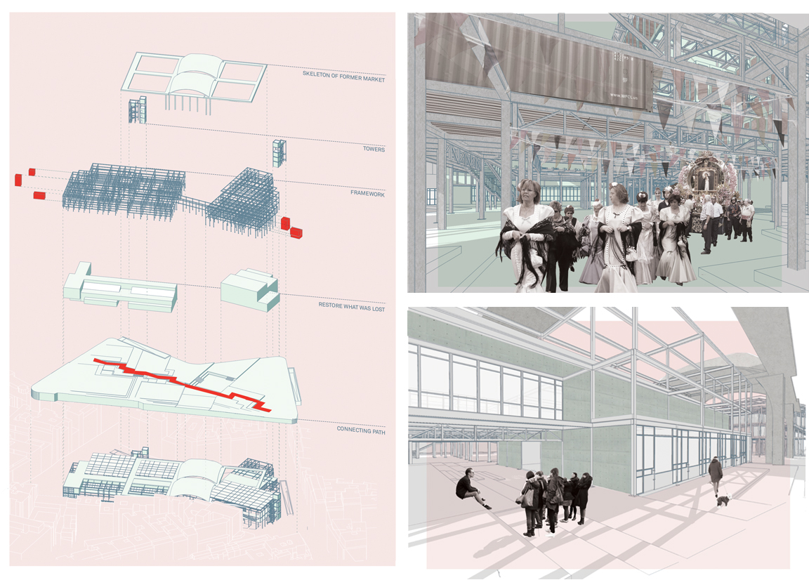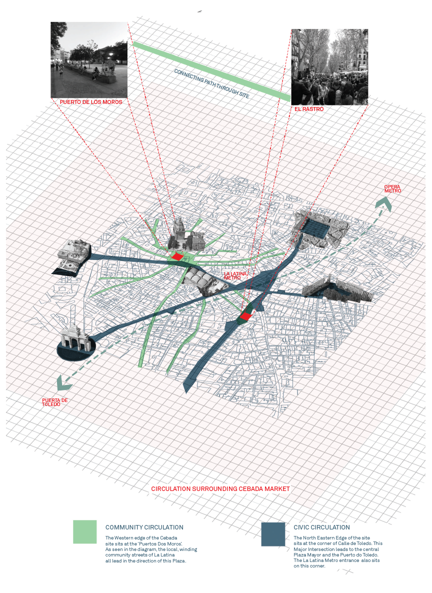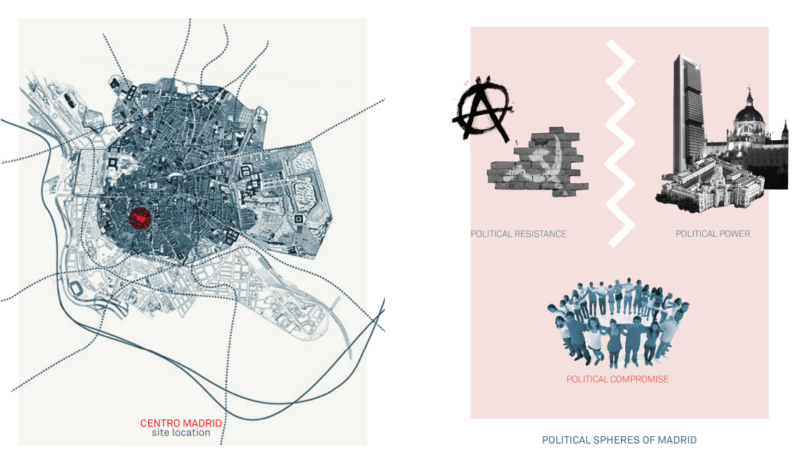 For my final thesis, The European City Project, my class was assigned the Spanish capital city of Madrid as our metropolitan focus. My thesis group ‘fields of interaction’ focused on the varying ‘living fields’ within the centre of Madrid and mapped the city based on social, political, economic, commercial and cultural hubs. We then focused our areas of research on the places of significance based on where these fields intersected and overlapped, showing the most significant areas of the city for local residents. I choose to focus on the political fields of interaction within the city; where 3 political spheres showed themselves, spaces of political power, space of political resistance, and finally spaces of political ‘compromise’. It was on these ‘Spaces of Compromise’, that I chose to focus my thesis; where informal and abandoned spaces are reclaimed by grassroots organizations aimed at serving their local neighbourhood. My thesis research explores the relationship between a formal structural framework designed to accommodate incremental and adaptable self-build space, in order to encourage the autonomy and empowerment of the residents Lavapies, a densely populated and underprivileged city centre area where these grassroots organizations seem to proliferate. The overall site scheme integrates this framework with more fixed and formal programmed space to fulfill present community needs, and to explore a hybridization of adaptable and fixed structures to examine a new typology that might maximize the potential and life span of a community centre.
